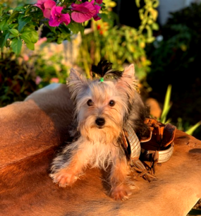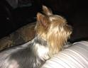 He is so shiny and soft.  A lap dog anyone?  Yorkies are the best companions.  If you've never owned a yorkie you will be hooked for life.  Small dog with big dog spirit!