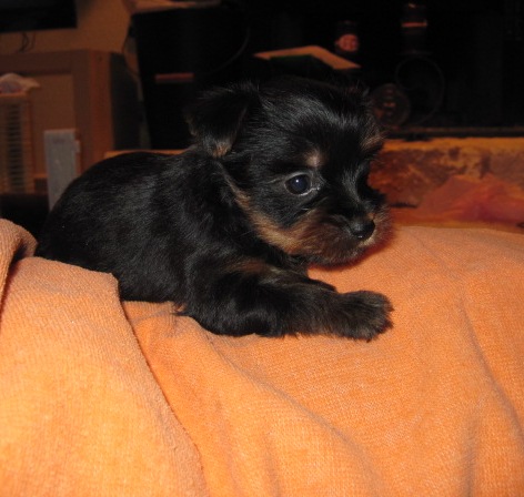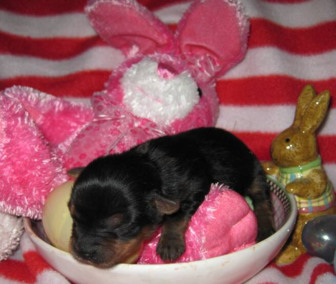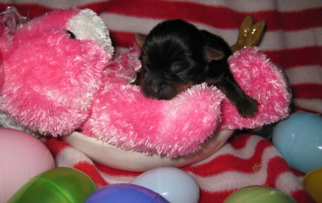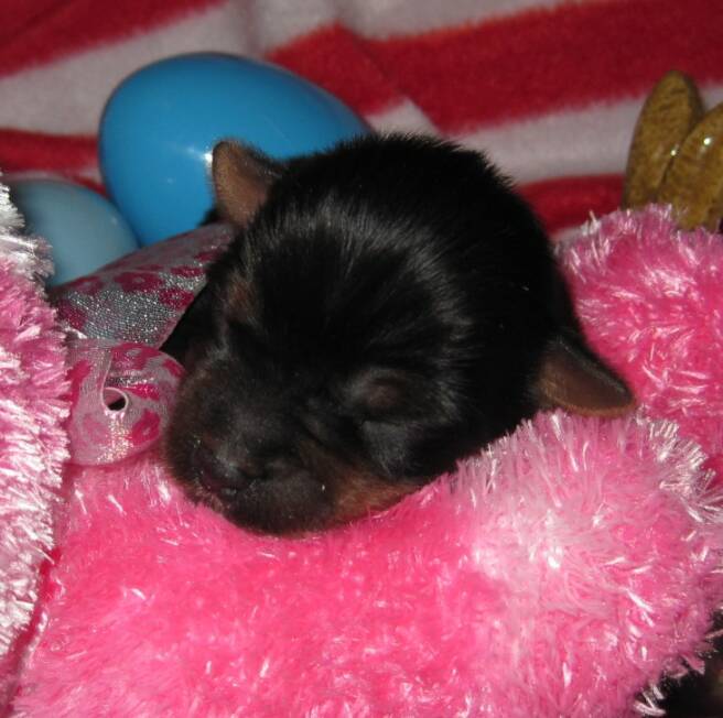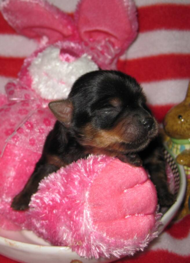 This is Baby Tar and Stucky's male puppy. He is the lightest in the litter. At 1 week old he weighs 5 oz. Approximate adult weight should be 2.5 lbs. This is what some call a teacup.