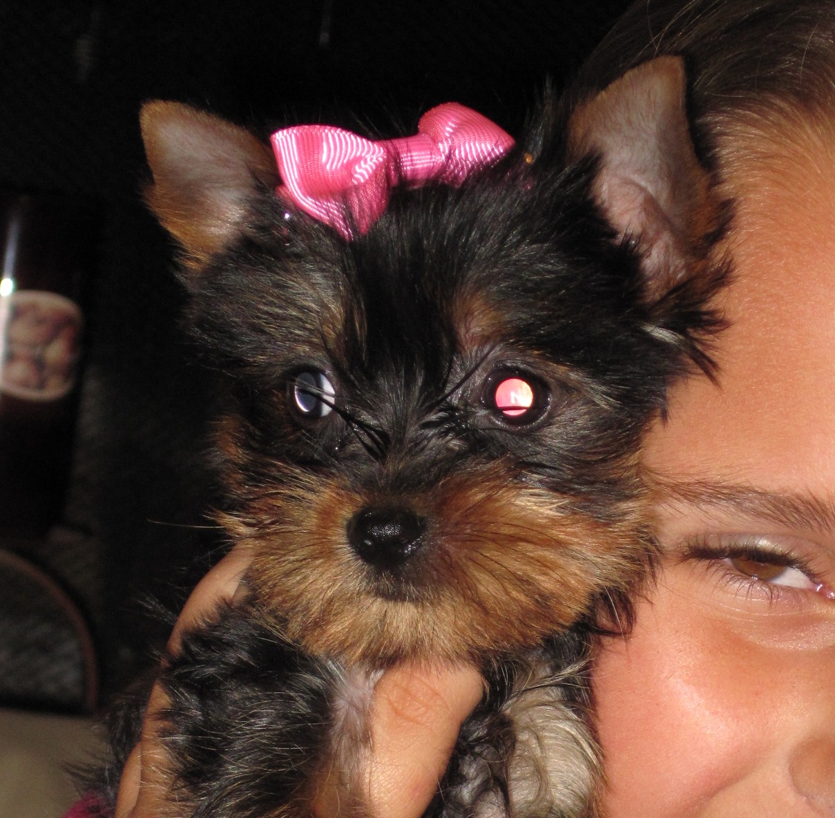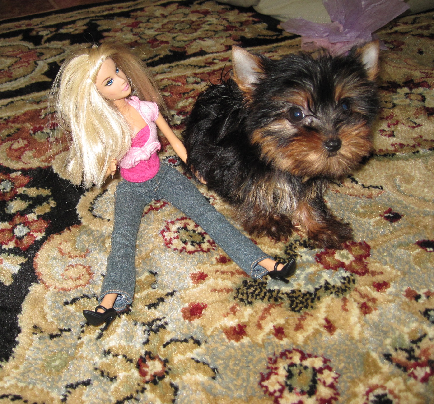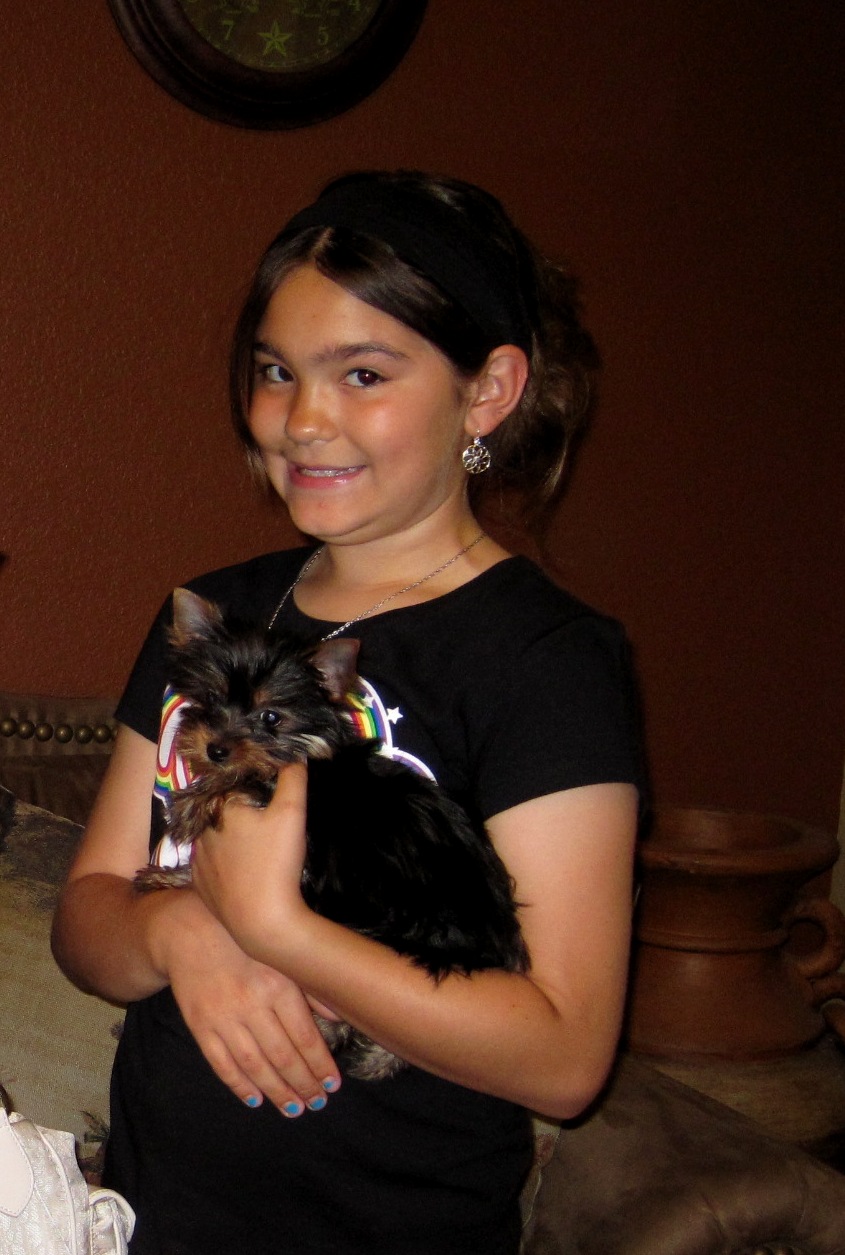 Kloey and her new teacup yorkie! An adorable pair! I think she will love dressing up her new little doll.