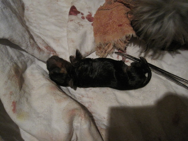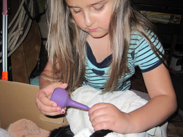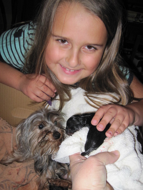 Kaleigh is our 8 year old in-house veterinarian. She suctions the mouth and nose to clear any fluids and is a great help with the puppies.