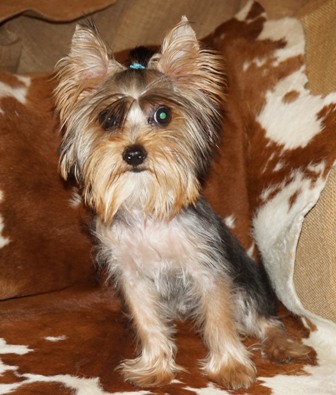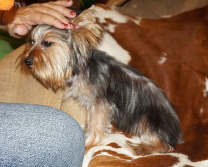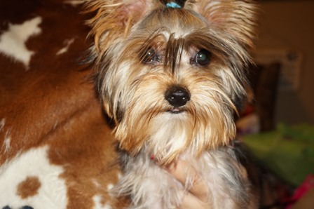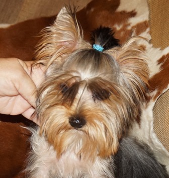 This is the female in the litter with an overbite. She is very sweet and looks a lot like her brother. She has white on her chest and chin which is very pretty. She has a great coat and her beard will be wonderful! It may cover up the overbite.
